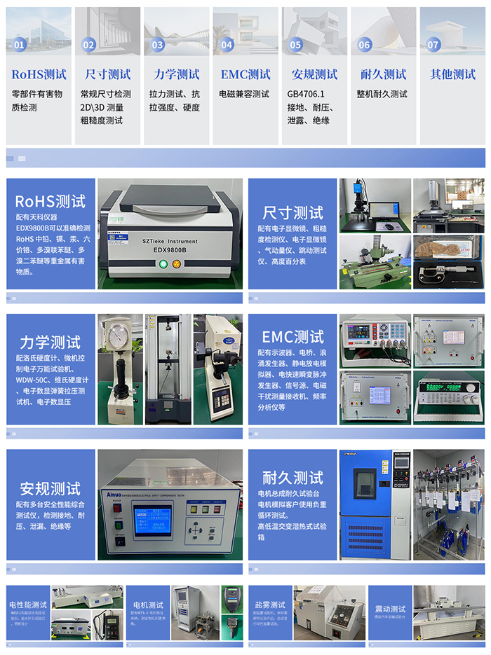 公司建有独立的实验室,有一批先进的精密的品质检测设备:三次元影像测试仪、高低温测试、耐雨淋、静音房等环境测试设备设施;老化房、挂重测试、功能测试等信赖性测试、x-ray环保物资测试仪、电子电桥测试仪等等,秉持“质量第一、顾客至上”的经营宗旨,以“创建世界名牌”为发展理念,不断优化企业管理模式,加大科技投入,为贡献社会打造现代化百年企业而奋斗。