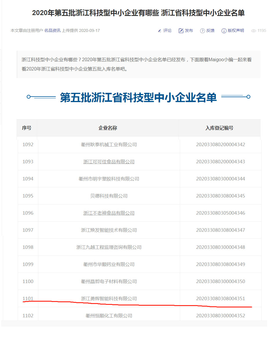 浙江省2020年第五批入库科技型中小企业名单